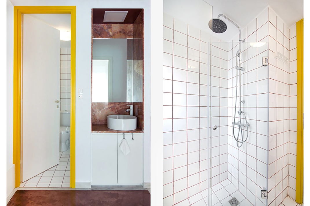 Το ροζ ακούμπησε κάποιες επιφάνειες και τα πόμολα των ντουλαπών, και τέλος το κίτρινο περιέγραψε τις κάσες των πορτών. Όσο για την πολυτέλεια; Γι’ αυτό, βασίστηκαν στο εξωτικό ροζ-μπορντώ μάρμαρο Ριτσώνας που έντυσε πάγκους, κομοδίνα και τη «φωλιά» του νιπτήρα.