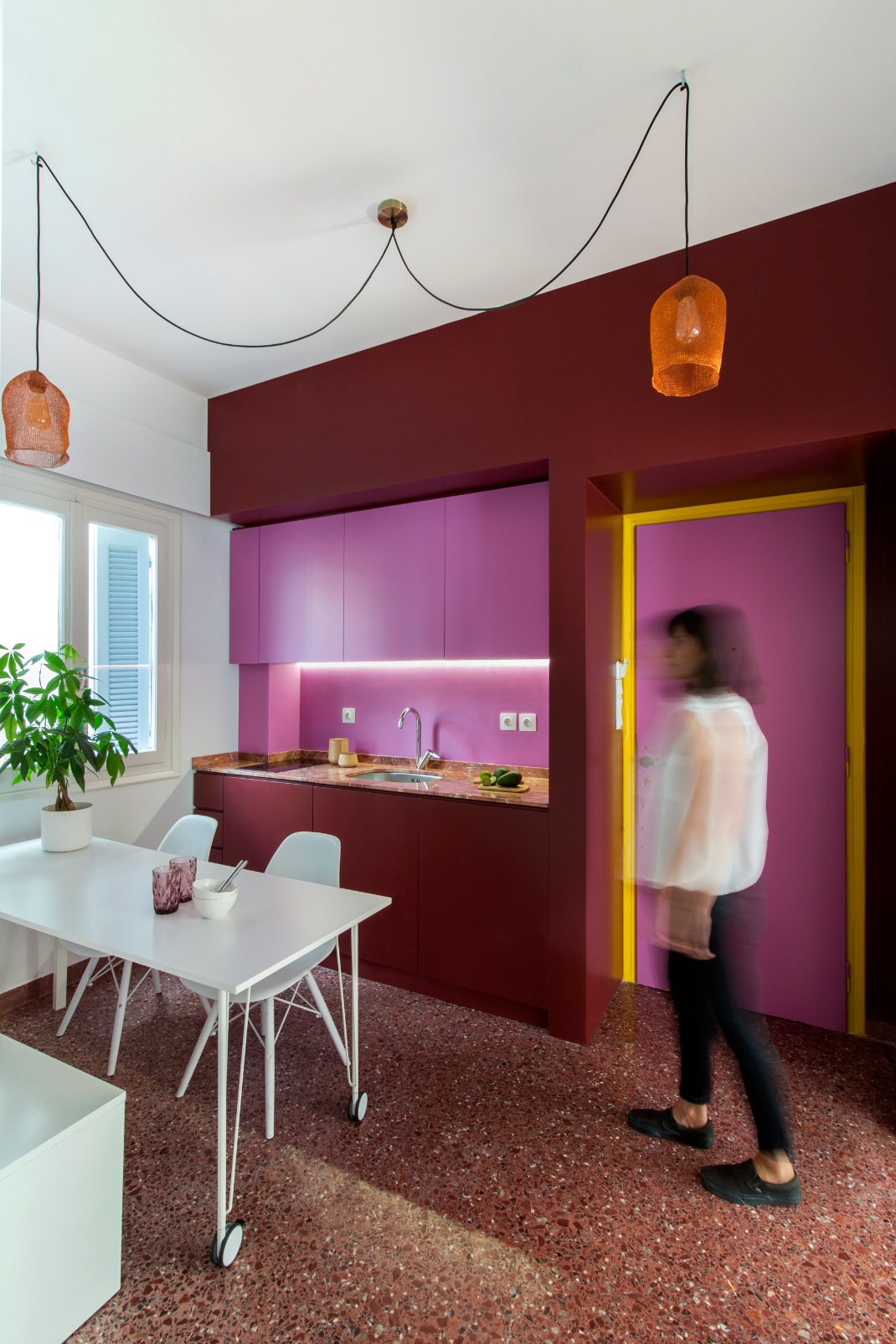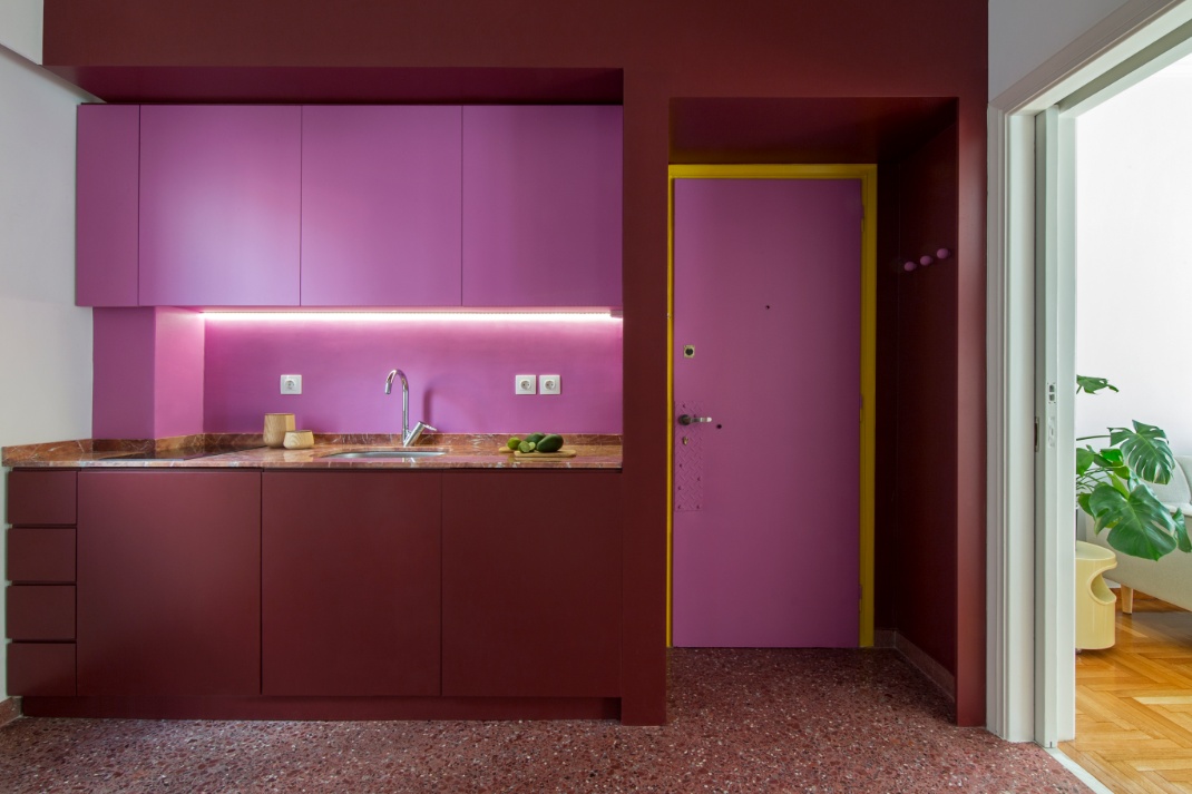 Η κουζίνα, που αντικρύζει κανείς μόλις μπει, έγινε ο καμβάς μιάς εκρηκτικής σύνθεσης χρωμάτων, τα οποία συνδυάστηκαν με παλιά και νέα υλικά. Το μπορντώ ήρθε από το μωσαϊκό δάπεδο, το οποίο συντηρήθηκε και συμπληρώθηκε σαν κέντημα, με γεμίσματα μαρμάρου και χρωματισμένου τσιμέντου.