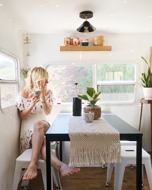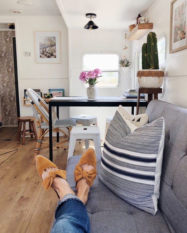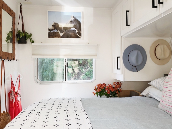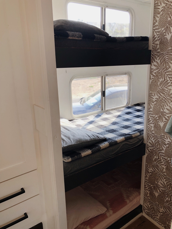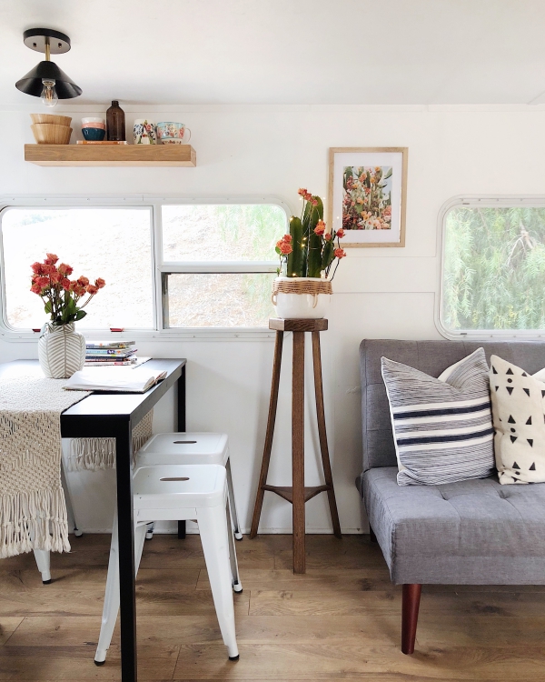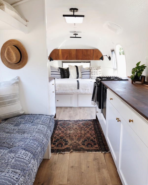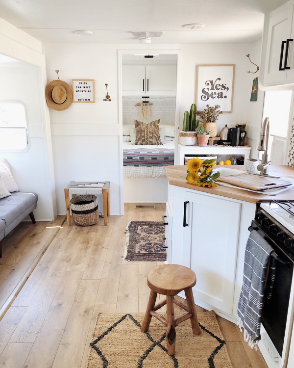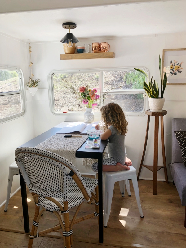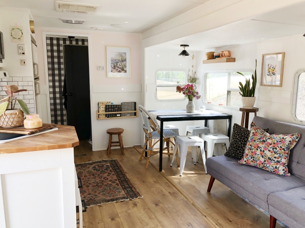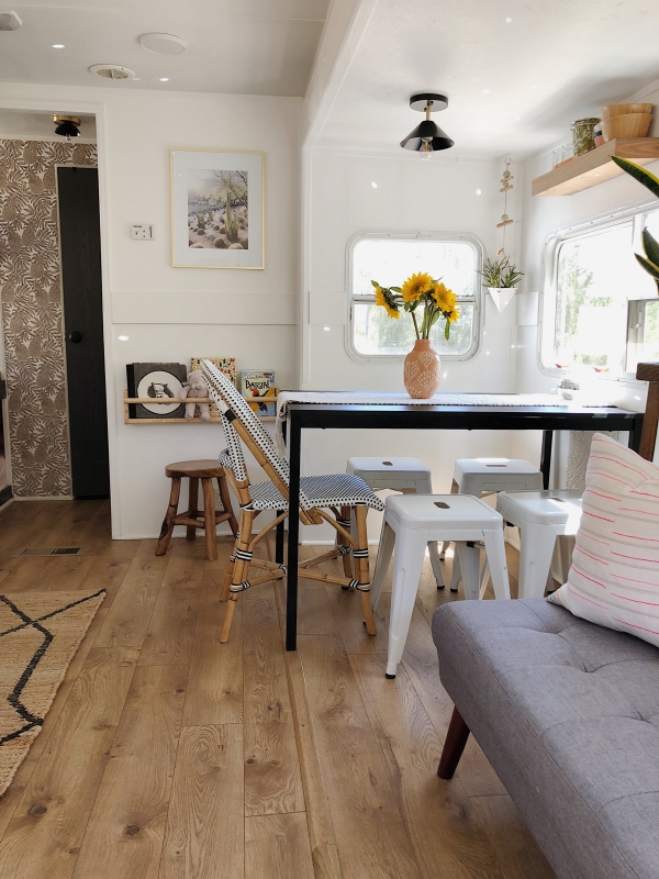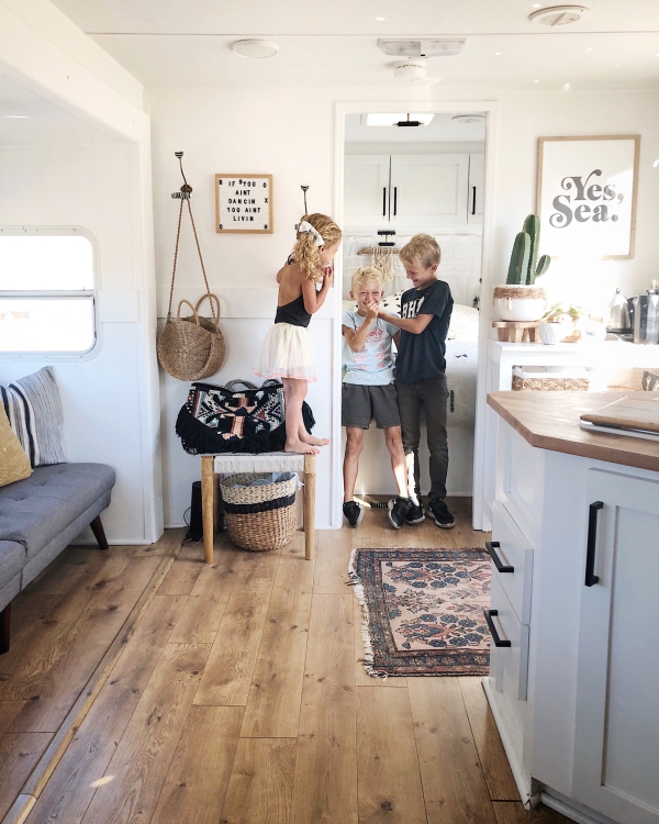 Το τροχόσπιτο έχει μια κυρίως κρεβατοκάμαρα για το ζευγάρι, μια τριπλή κουκέτα για τα παιδιά και έναν ενιαίο χώρο κουζίνα, τραπεζαρία καθιστικό. Και είναι cozy. Και πανέμορφο: