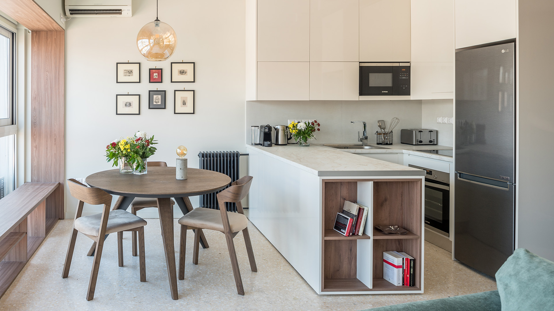 Το διαμέρισμα στον τέταρτο όροφο μιας πολυκατοικίας του ’60 στο κέντρο της Αθήνας προσφέρει σε ένα νέο ζευγάρι μια βάση και έναν κομψό τρόπο ζωής, με σεβασμό στα στοιχεία των παλαιών ημερών.