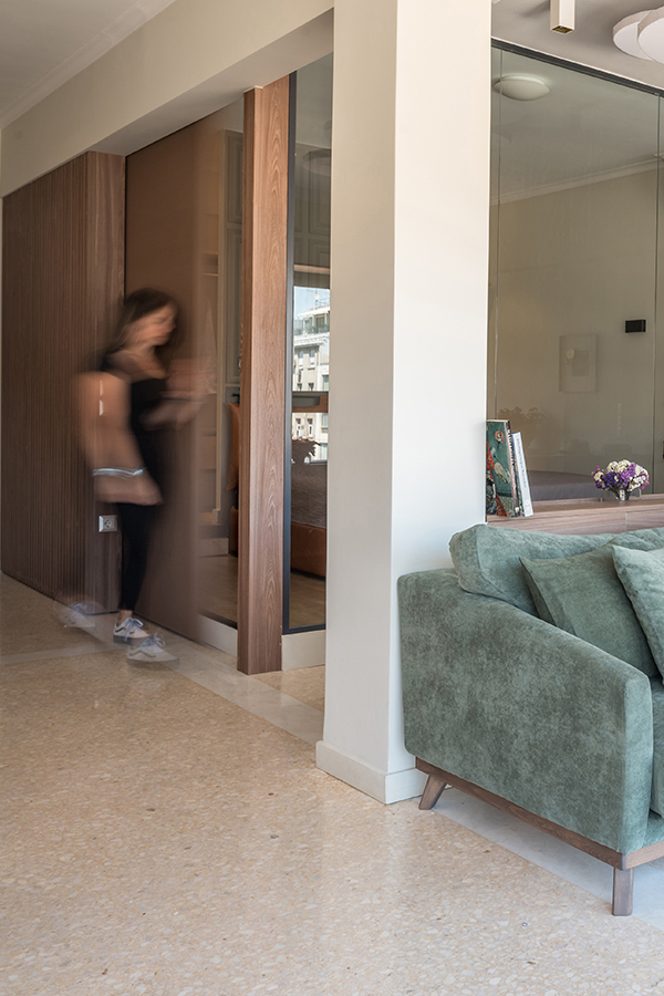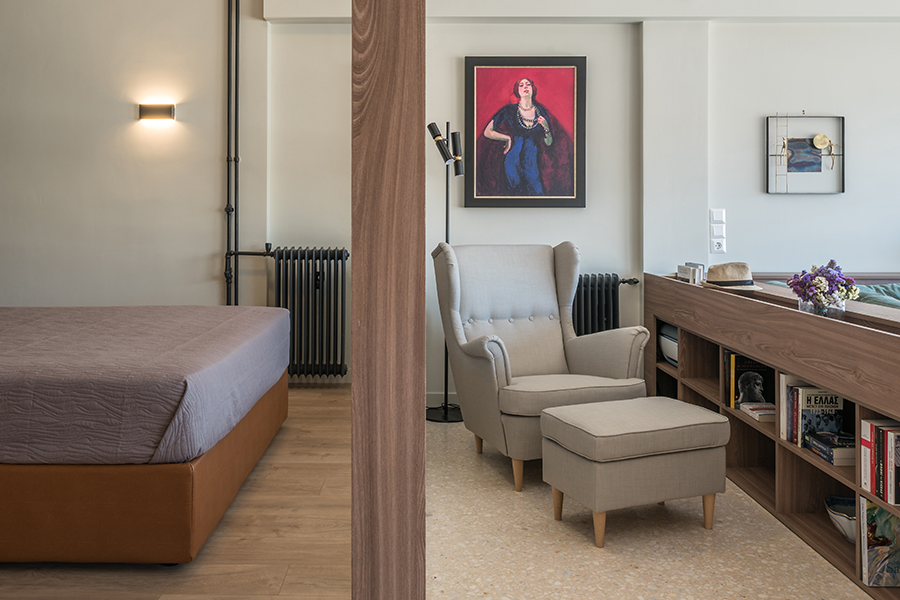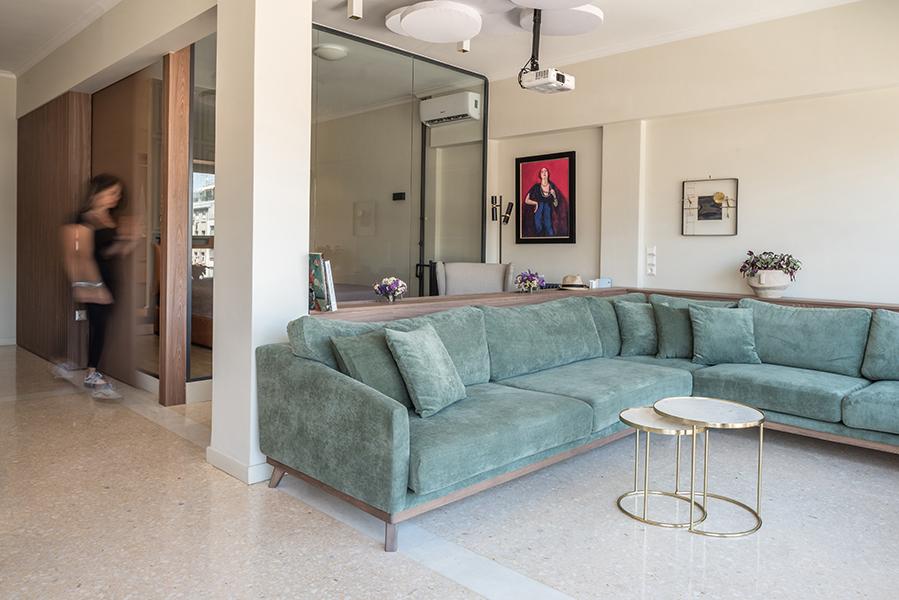 Μετά από μια πλήρη ανακαίνιση κατασκευής και αλλαγή της χρήσης του χώρου από γραφείο σε κατοικία, το διαμέρισμα προσανατολίζεται ολοκληρωτικά στην πανοραμική θέα προς την παλιά Βουλή των Αθηνών. Δίνοντας έμφαση στην οπτική αίσθηση, μια ξύλινη περιμετρική κατασκευή πλαισιώνει την πρόσοψη και τη θέα, ενώ φιλοξενεί το φως που εισβάλλει σε ολόκληρο το διαμέρισμα. Για τον σκοπό αυτό, οι εσωτερικοί χώροι απογυμνώθηκαν χρησιμοποιώντας ειδικά φινιρίσματα και αξιοποιώντας κάθε γωνία στο έπακρο με ειδικά σχεδιασμένα έπιπλα.