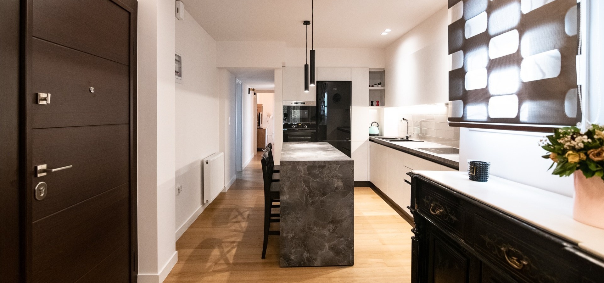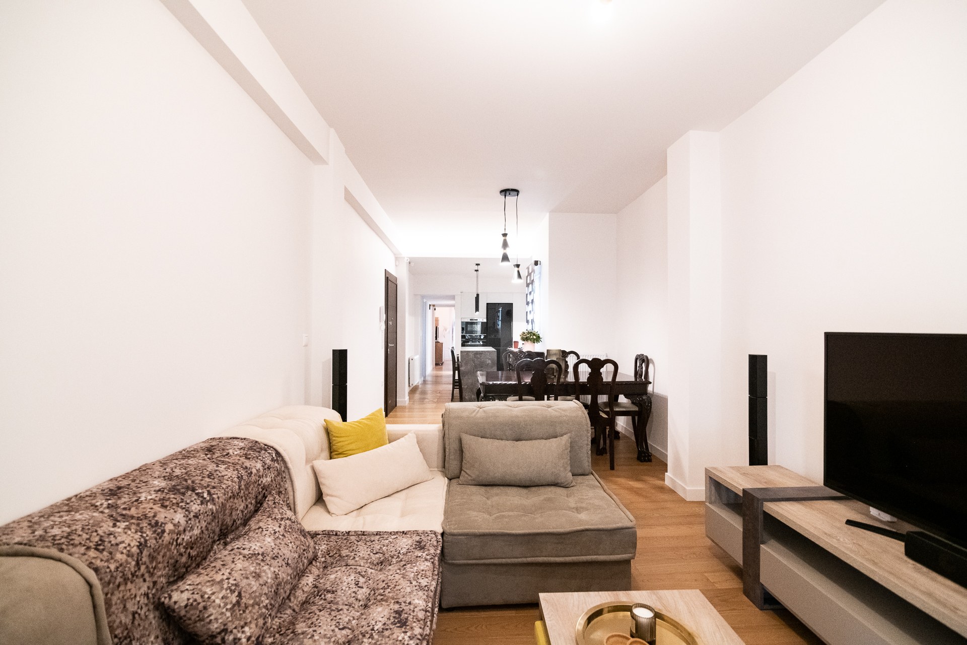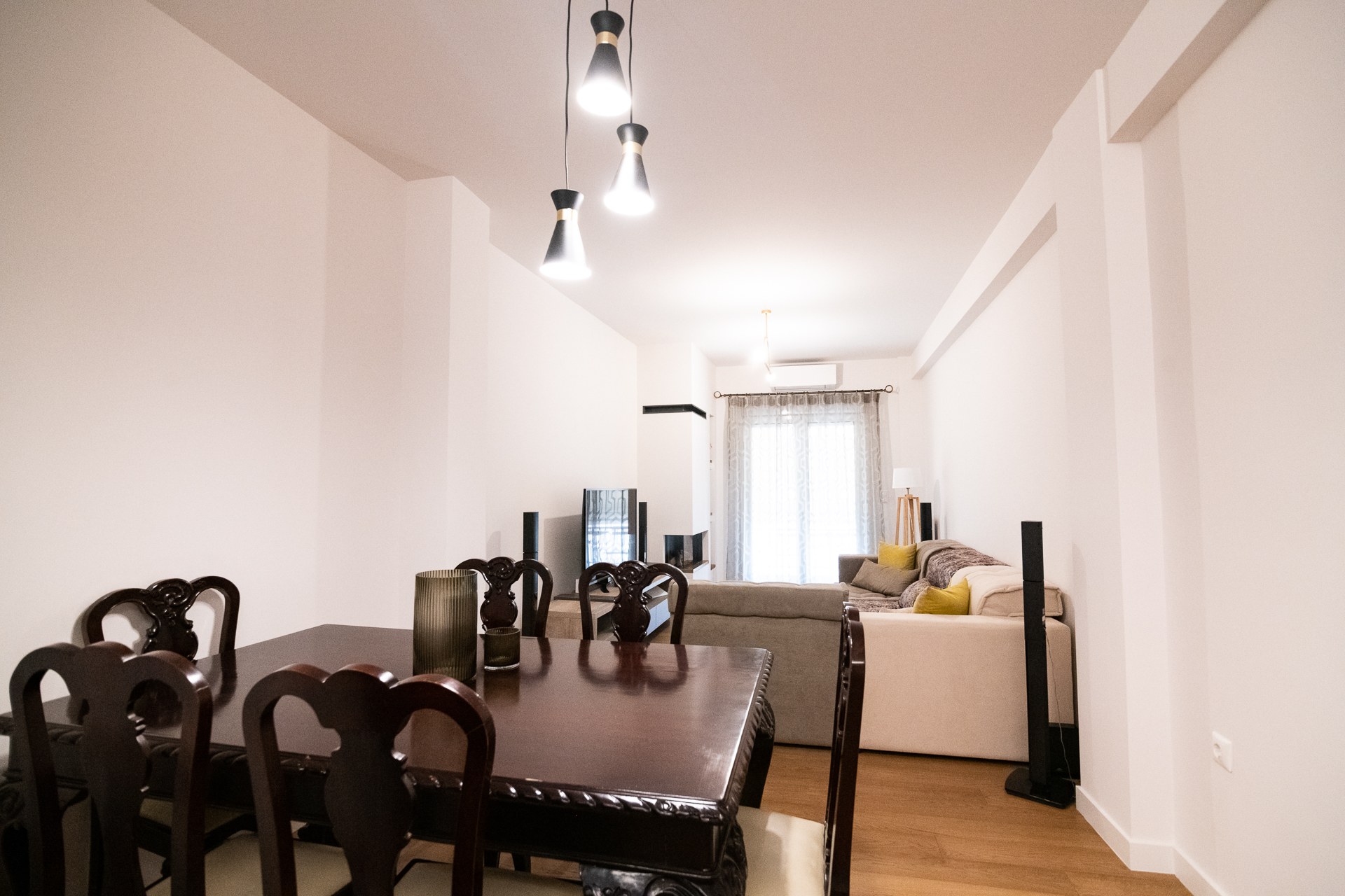 Τέλος, η επιλογή αρμονικών φωτιστικών και σύγχρονης επίπλωσης συμπληρώνουν την ανανεωμένη εικόνα του διαμερίσματος.