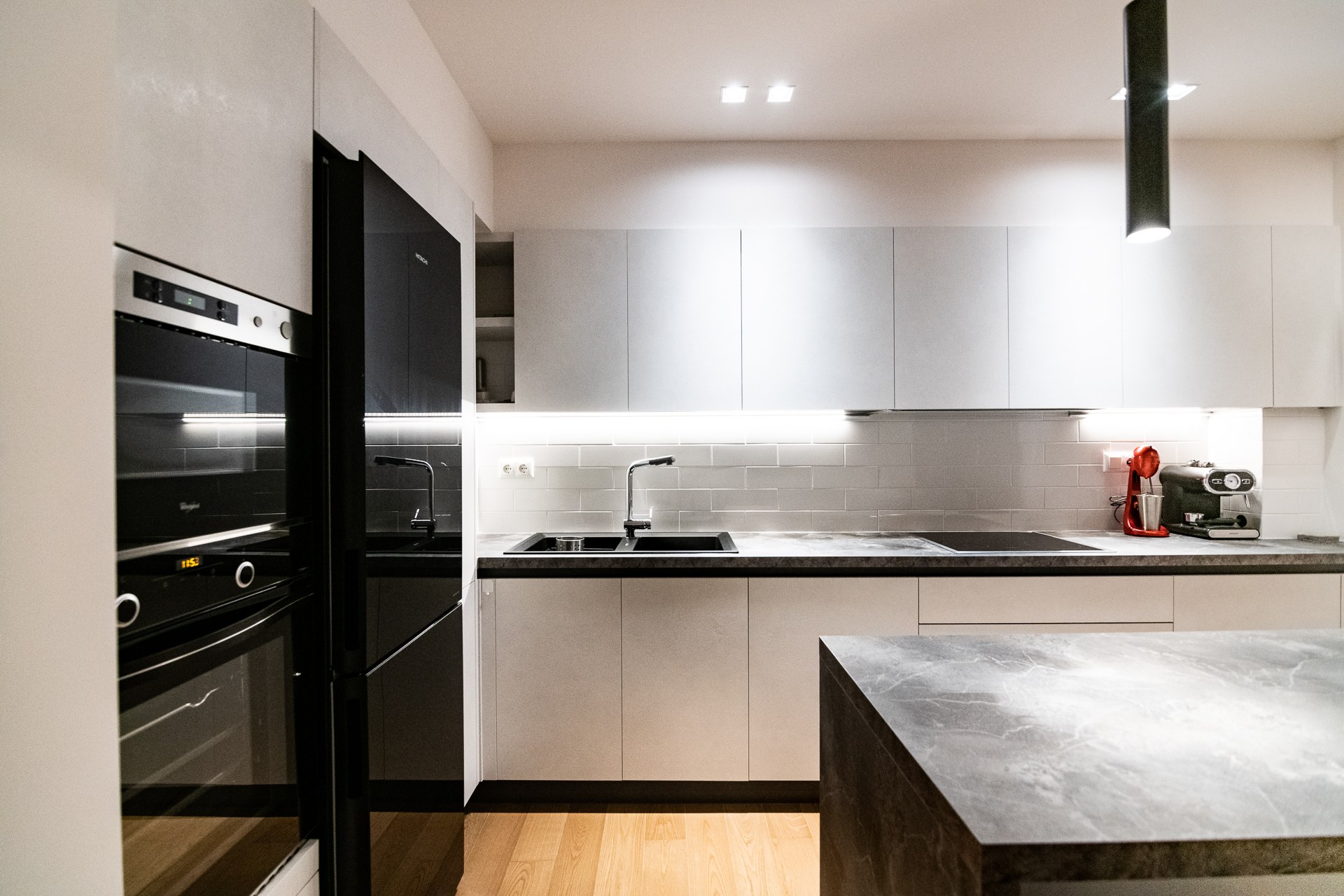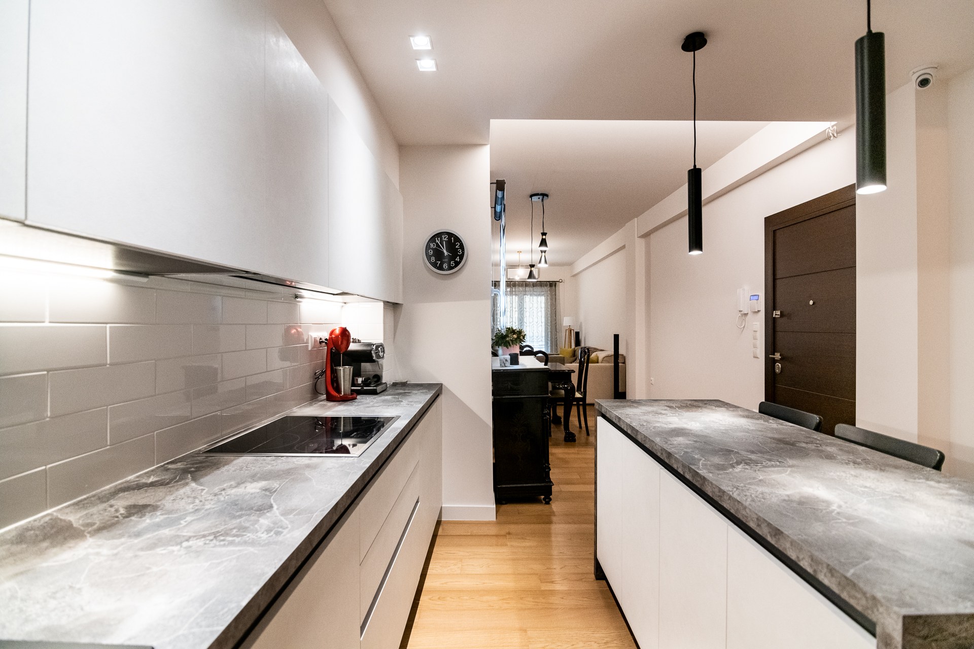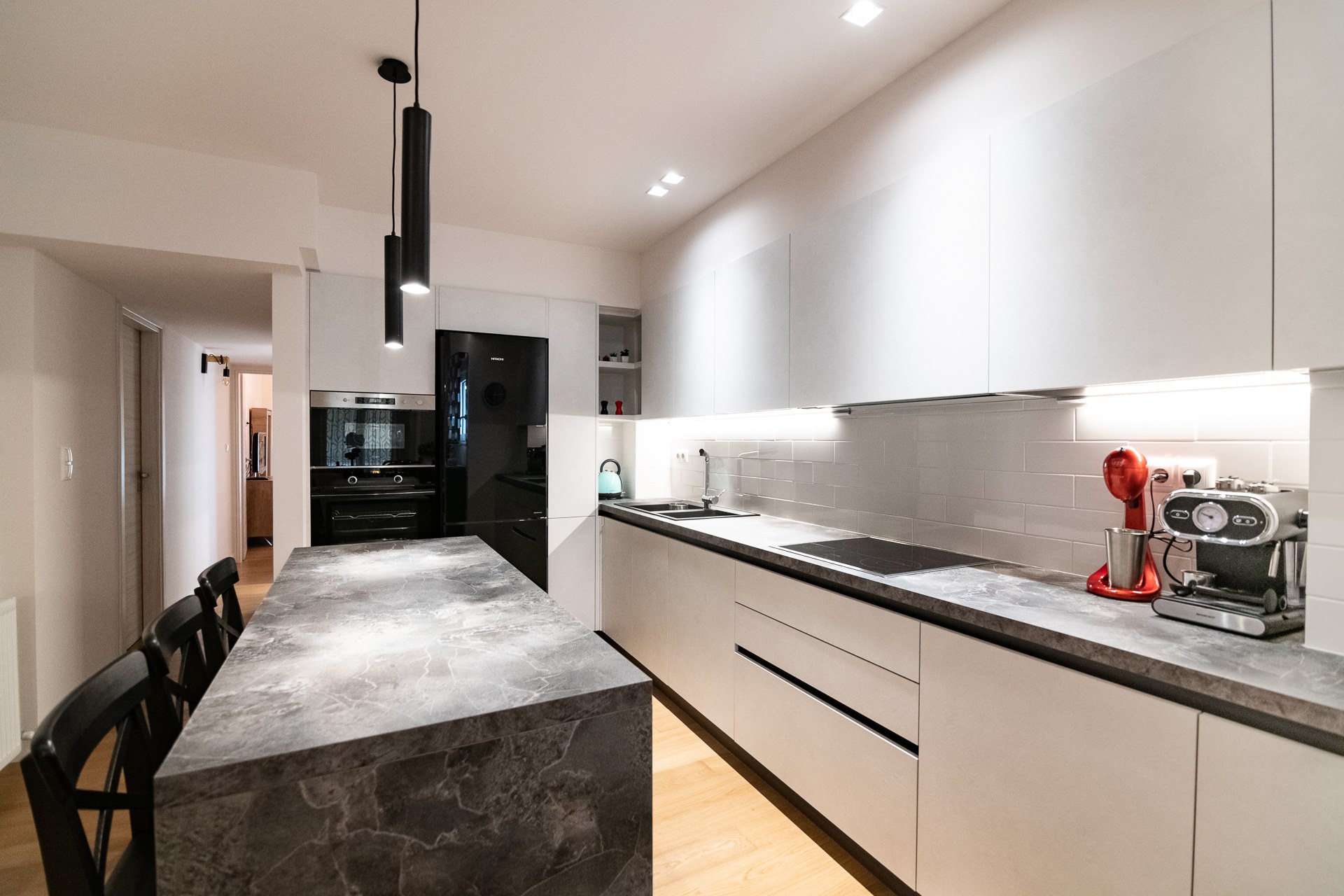 Μοντέρνα και σύχρονη η νέα κουζίνα Ιταλικών προδιαγραφών σε ματ αποχρώσεις που σε συνδιασμό με το βακελιτικό πάγκο σε υφή μαρμάρου αναδεικνύουν το χώρο, πλήρως εξοπλισμένη με μηχανισμούς απόσβεσης και δεν διαθέτει πόμολα καθώς επιλέχθηκε να είναι τύπου gola.