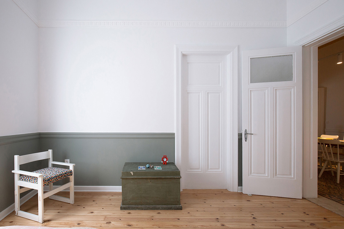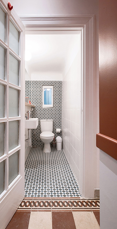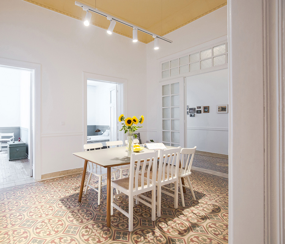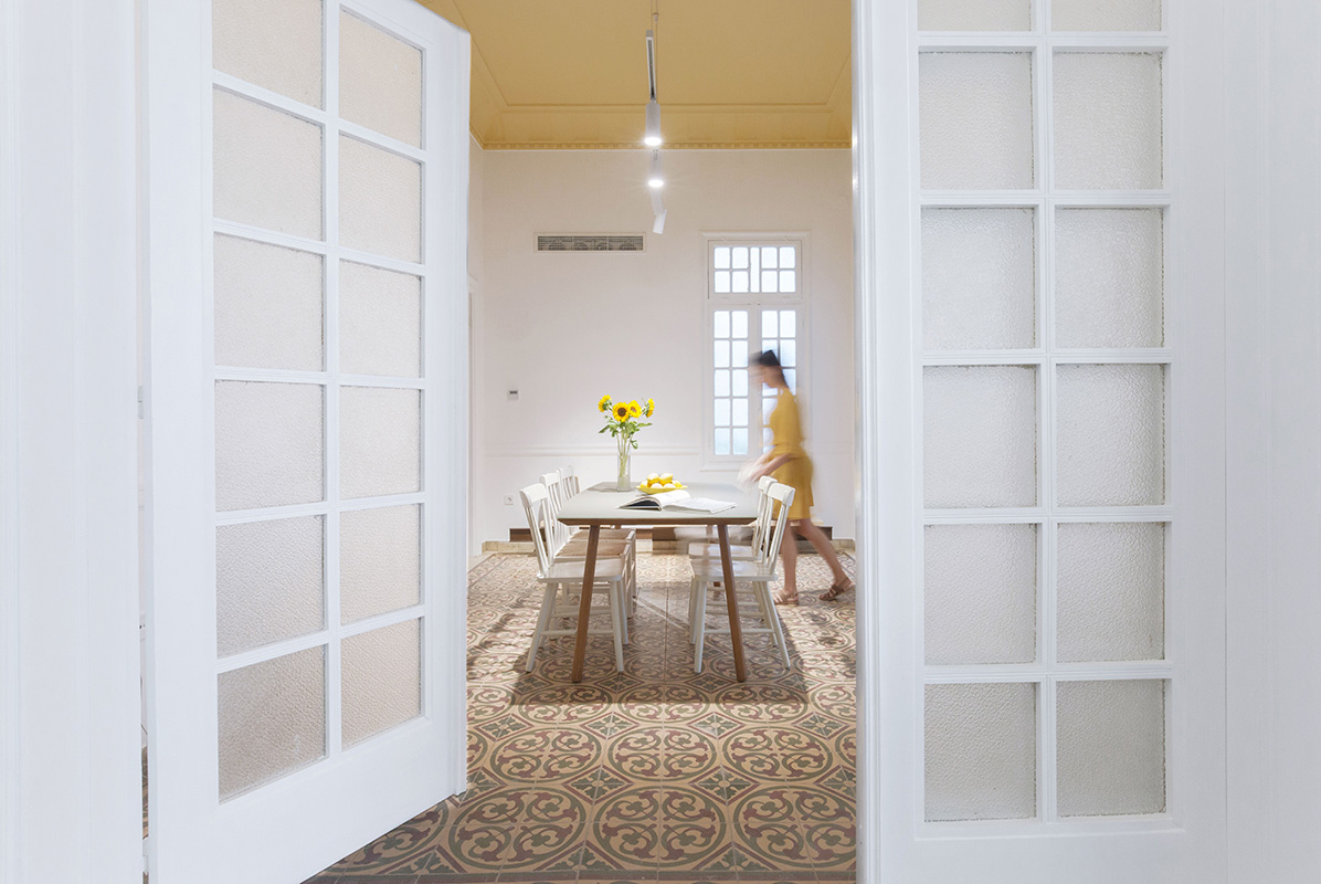 Το λευκό χρώμα επικρατεί και πλαισιώνει τα διαφορετικά χρώματα που επιλέχθηκαν για τον κάθε χώρο. Στο χωλ και την τραπεζαρία, η ώχρα του δαπέδου καθρεπτίζεται στην οροφή, στα υπνοδωμάτια το πράσινο λεβάντας καλύπτει τη βάση των τοίχων και οι τοίχοι του διαδρόμου χρωματίστηκαν σε πορφυρή απόχρωση αναδεικνύοντας τα υφιστάμενα τσιμεντοπλακάκια.
