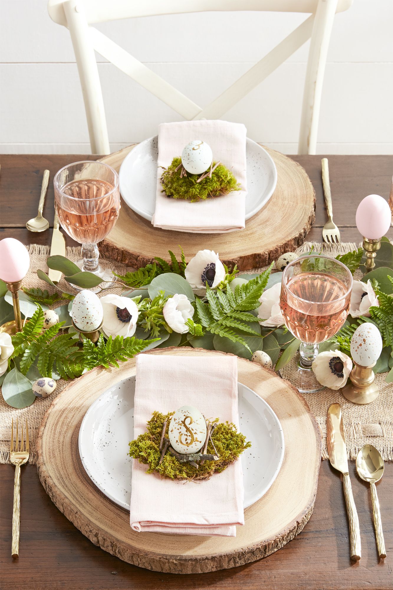 1 Φτιάξτε ένα φυσικό ντεκόρ που να θυμίζει εξοχικό για το πασχαλινό τραπέζι με φυτά του αγρού, ξύλο και λινάτσα.