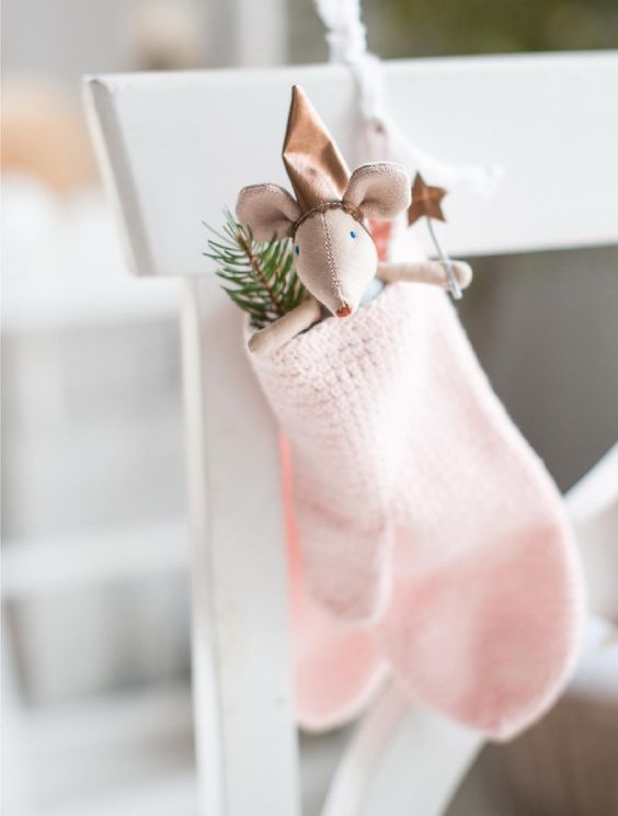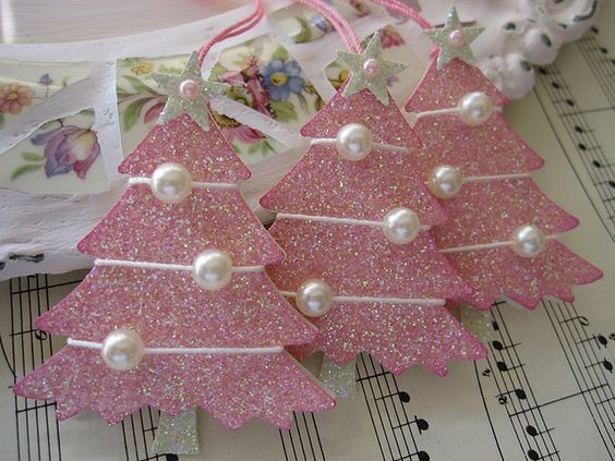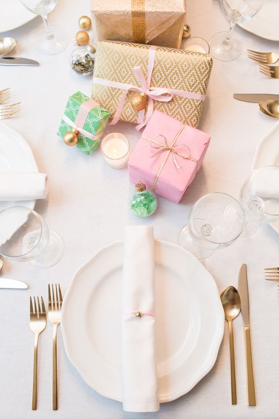 Πριν φύγουν οι καλεσμένοι σας από τα εορταστικά τραπέζια, προσφέρετέ τους ένα μικρό δώρο σε αυτά τα χρώματα: ένα μικρό στολίδι για το δέντρο που θα έχετε διακοσμήσει μόνοι σας με χρυσόσκονη και θα το έχετε συνδυάσει με ροζ πέρλες.