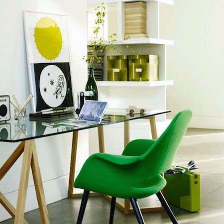 7. Αν χρειάζεστε χώρο εργασίας, αποφύγετε τα μεγάλα γραφεία και επιλέξτε ένα ράφι ή έναν πάγκο που να στηρίζετε στον τοίχο χωρίς ποδαράκια. Ιδανικά συνδυάστε το με λευκή ή με πτυσσόμενη καρέκλα.