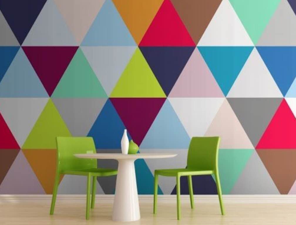 Τρίγωνα με δύο, τρία ή τέσσερα χρώματα μπλέκονται μεταξύ τους και σχηματίζουν επιφάνειες με πολύ ενδιαφέρον. Χρησιμοποιήστε αυτά τα σχήματα σε τοίχο, σε ταπετσαρίες, σε μαξιλάρια, σε χαλάκια για το πάτωμα, ακόμη και σαν εκτυπωμένες επιφάνειες για κάδρα.