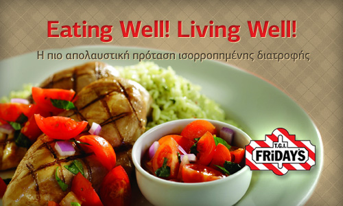 Επισκεφθείτε σήμερα κιόλας ένα από τα εστιατόρια T.G.I. Friday’s και δοκιμάστε τις νέες “Living Well” γευστικές επιλογές που σας προτείνω. Επιλέξτε το πιάτο της αρεσκείας σας και απολαύστε ένα γεύμα με ευεργετικά λιπαρά και απίθανη γεύση. Και μην ξεχνάτε ότι στα T.G.I. Friday’s είναι πάντα Παρασκευή!
