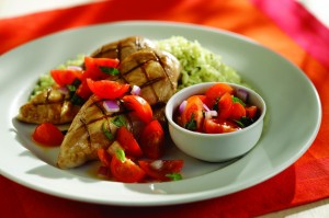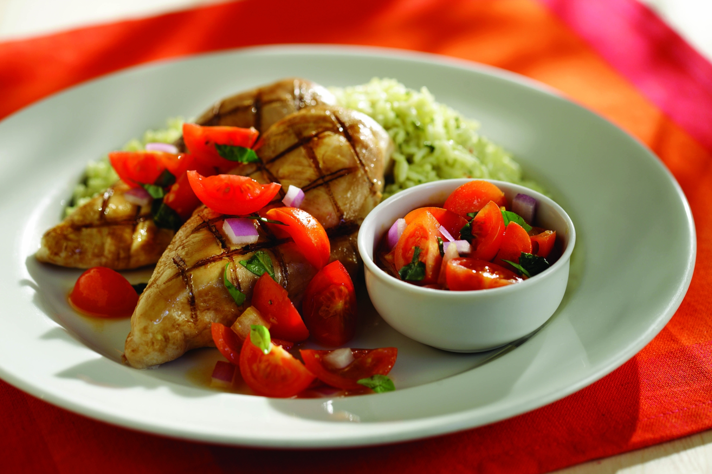 Τι περιέχει: Δύο ζουμερά στήθη κοτόπουλου σχάρας που επικαλύπτονται με σπιτική salsa από cherry ντοματάκια, φρέσκα κρεμμυδάκια και βασιλικό. Συνοδεύονται με επιλογή από ρύζι με μυρωδικά ή μίγμα πράσινης σαλάτας με μαρούλι romaine και ρόκα.