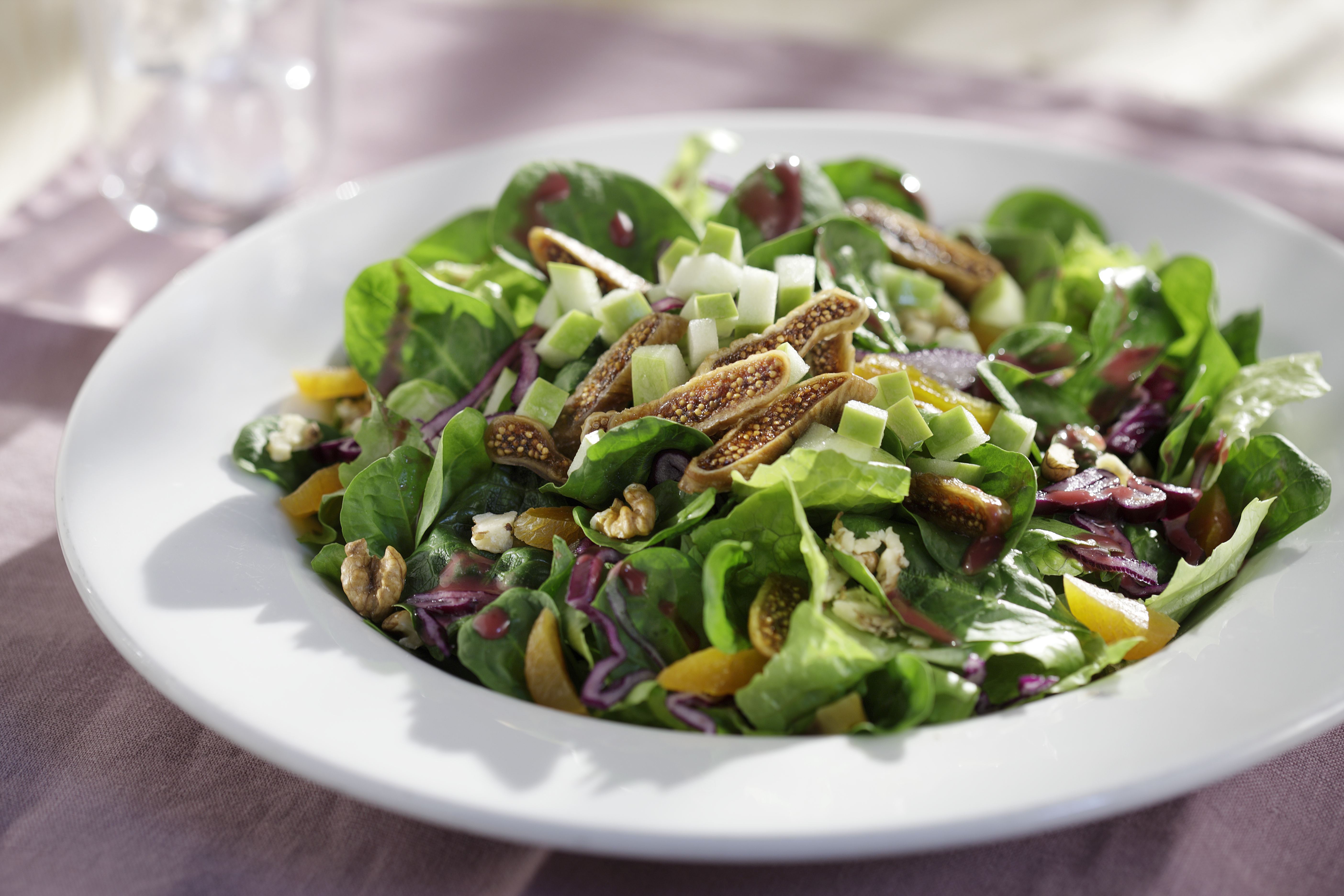 Τι περιέχει: Θρεπτική ανάμικτη σαλάτα με φύλλα μαρουλιού romaine, baby σπανάκι, καρύδια, αποξηραμένα βερύκοκα και σύκα και κόκκινο λάχανο. Ενισχύεται με σπιτικό dressing ροδιού με μέλι και αποξηραμένα cranberries και γαρνίρεται με κύβους φρέσκου πράσινου μήλου.