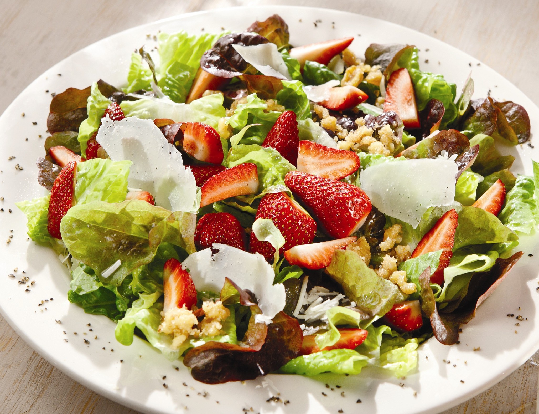 Τι περιέχει: Δροσερή σαλάτα με κόκκινο και πράσινο μαρούλι, παρμεζάνα και γκλασαρισμένα καρύδια. Αναμιγνύεται με Balsamic Vinaigrette dressing και γαρνίρεται με κομμένες φρέσκες φράουλες επικαλυμμένες με balsamic marinade. Μια σαλάτα που ξεχειλίζει από καλά συστατικά και έχει υπέροχη γεύση.