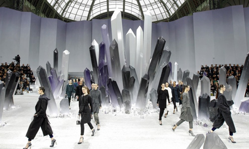 Τον παραµυθένιο βυθό του τελευταίου show του οίκου Chanel αυτήν τη φορά διαδέχτηκε ένα παγερό σκηνικό από κρυστάλλινους σταλαγµίτες, που φόρτιζε µε δραµατικό χαρακτήρα το περίφηµο Grand Palais. Οι επιλογές του Karl Lagerfeld ήταν περισσότερο hard mood απ’ ό,τι έχουµε συνηθίσει, µε αρκετά βαριά χρώµατα, φαρδιά πλεκτά και φόρµες µε τονισµένους ώµους, παντελόνια κάτω από φούστες και oversized πανωφόρια. Ήταν µια γιορτή χρωµάτων και υλικών, πλαισιωµένη από µια αίσθηση µαγείας, όπου όπως πάντα ήταν όλα προσεγµένα µέχρι την παραµικρή λεπτοµέρεια. H πιο χαριτωµένη στιγµή του show ήταν όταν εµφανίστηκε ένα 3χρονο αγοράκι µε µια µίνι Chanel bag στο χέρι.