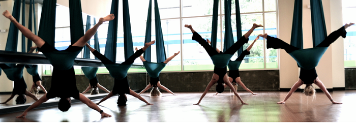 3) Aerial yoga – Περιλαμβάνει μια σειρά ασκήσεων προερχόμενες από τη γιόγκα και εναέριες ακροβατικές ασκήσεις, με τη χρήση ειδικά κατασκευασμένης αιώρας