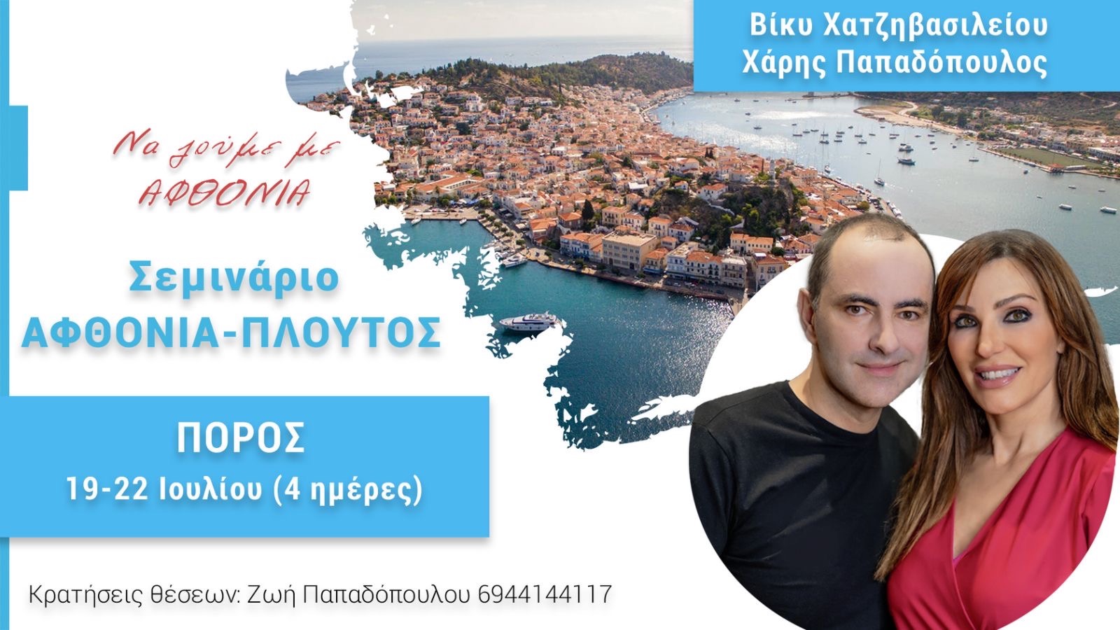 ΑΦΘΟΝΙΑ – ΠΛΟΥΤΟΣ: Το πιο εναλλακτικό ΠΑΚΕΤΟ διακοπών στον Πόρο, στις 19-22 Ιουλίου. Σεμινάριο αυτοβελτίωσης και ευζωίας σε υπέροχο ξενοδοχείο με τυρκουάζ παραλία, με εισηγητές τη Βίκυ Χατζηβασιλείου και τον Χάρη Παπαδόπουλο.