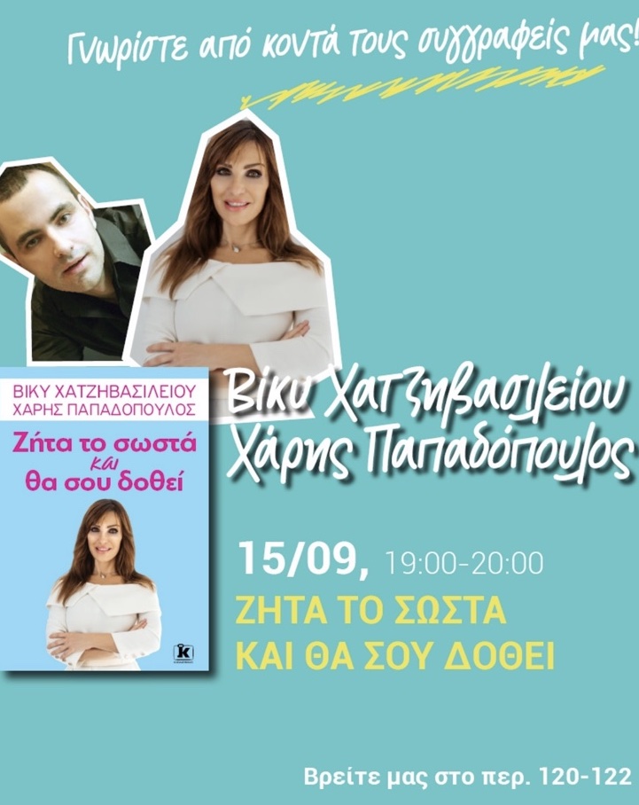 Ελάτε στο περίπτερο 120 -122 στις 15 Σεπτεμβρίου 2021 και οι συγγραφείς Βίκυ Χατζηβασιλείου και Χάρης Παπαδόπουλος θα σας υπογράψουν το νέο τους βιβλίο “Ζήτα το σωστά και θα σου δωθεί”.